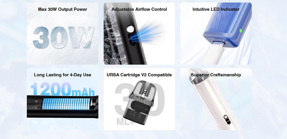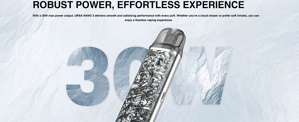Το URSA NANO 3 προσφέρει μέγιστη ισχύ 30W με μπαταρία 1200mAh, παρέχοντας έως και 4 ημέρες χρήσης και είναι συμβατό με τις δεξαμενές URSA Cartridge V2. Απολαύστε ρυθμιζόμενη ροή αέρα και εξαιρετική γεύση σε κάθε εισπνοή.